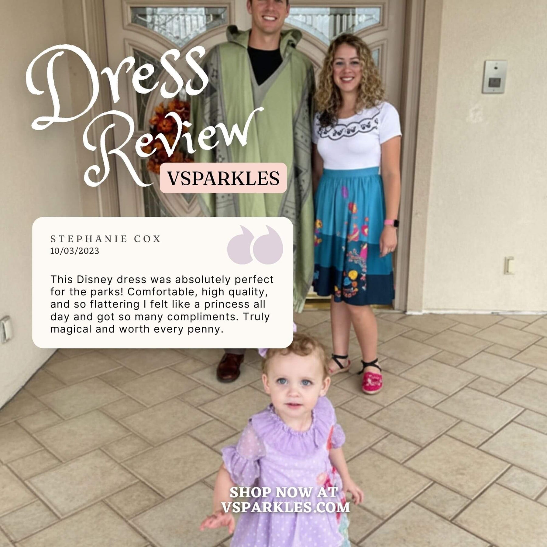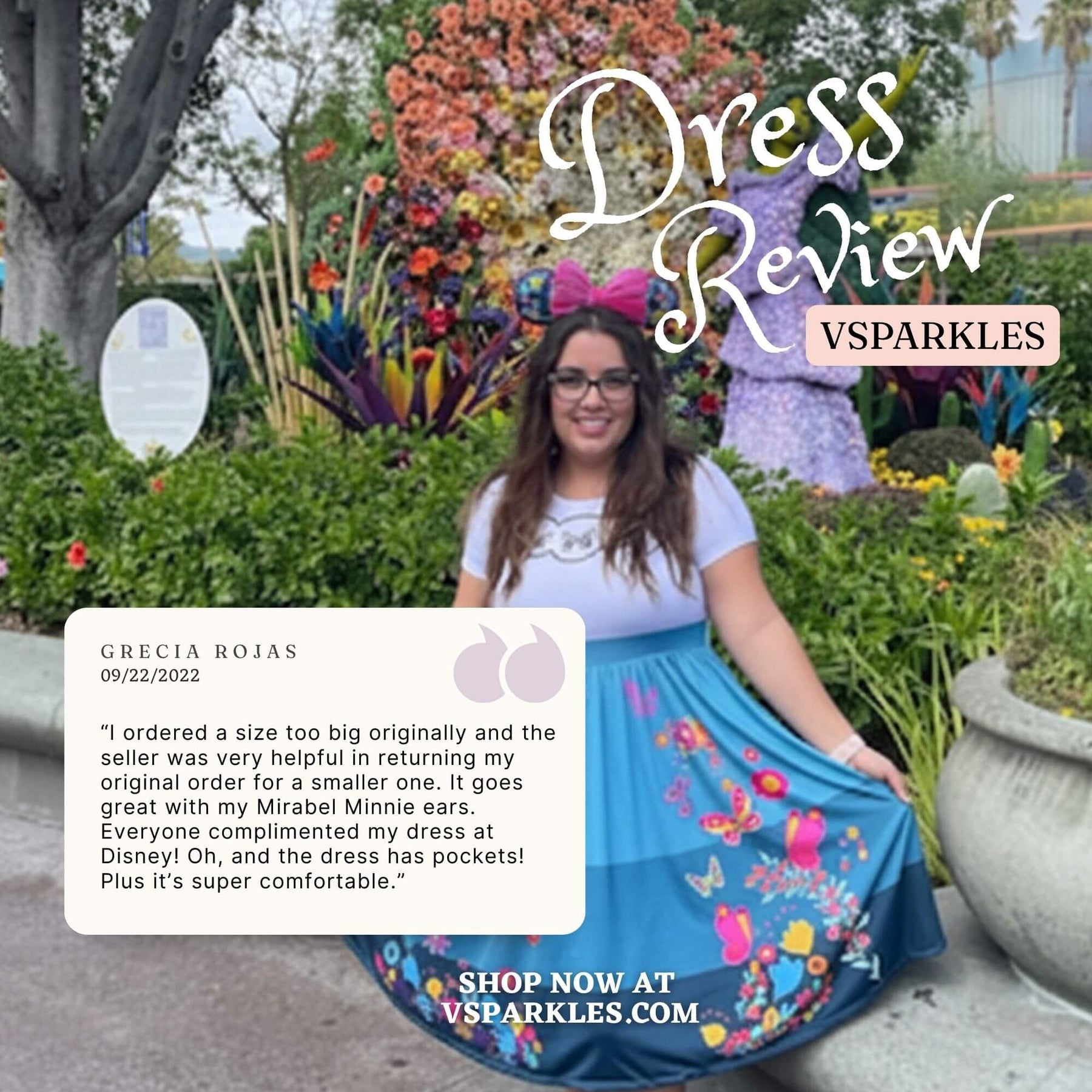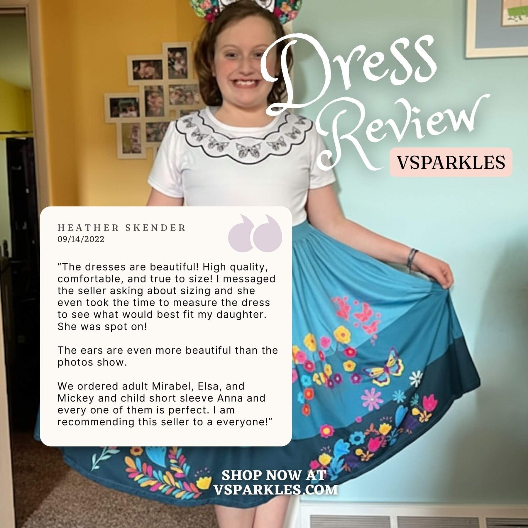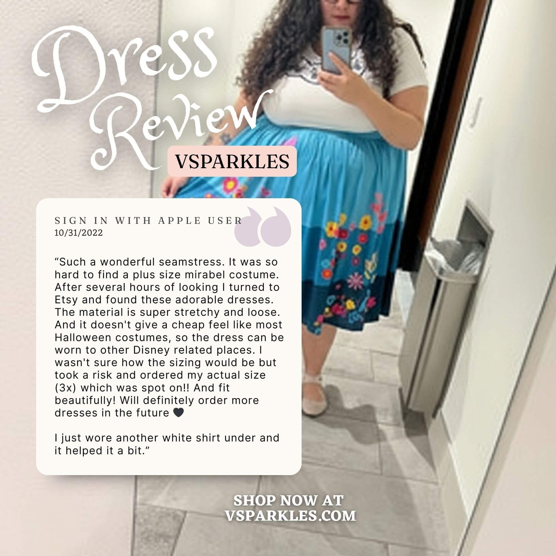 I read the reviews before purchasing this dress. I used the size chart which was recommended by the seller also. The material is super soft as the reviews have said. I love the way it fits, and I look forward to wearing it for Halloween and later to Disneyland!