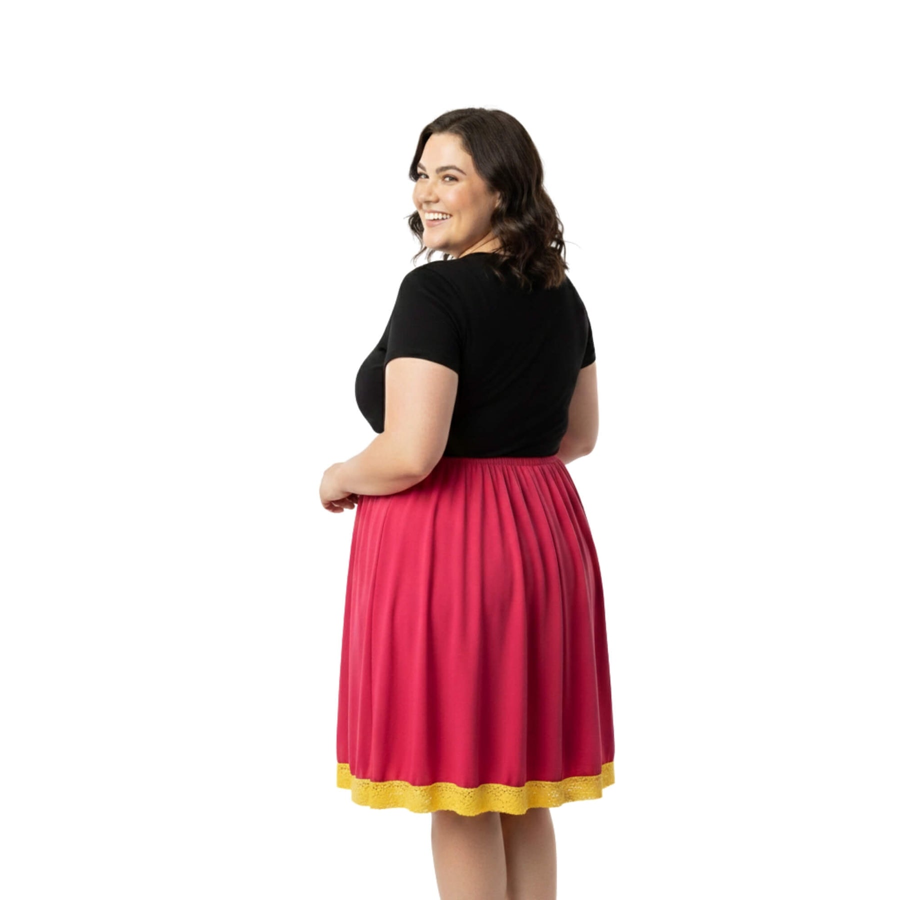 Vibrant red skirt with yellow crochet cotton trim for playful movement and visual contrast