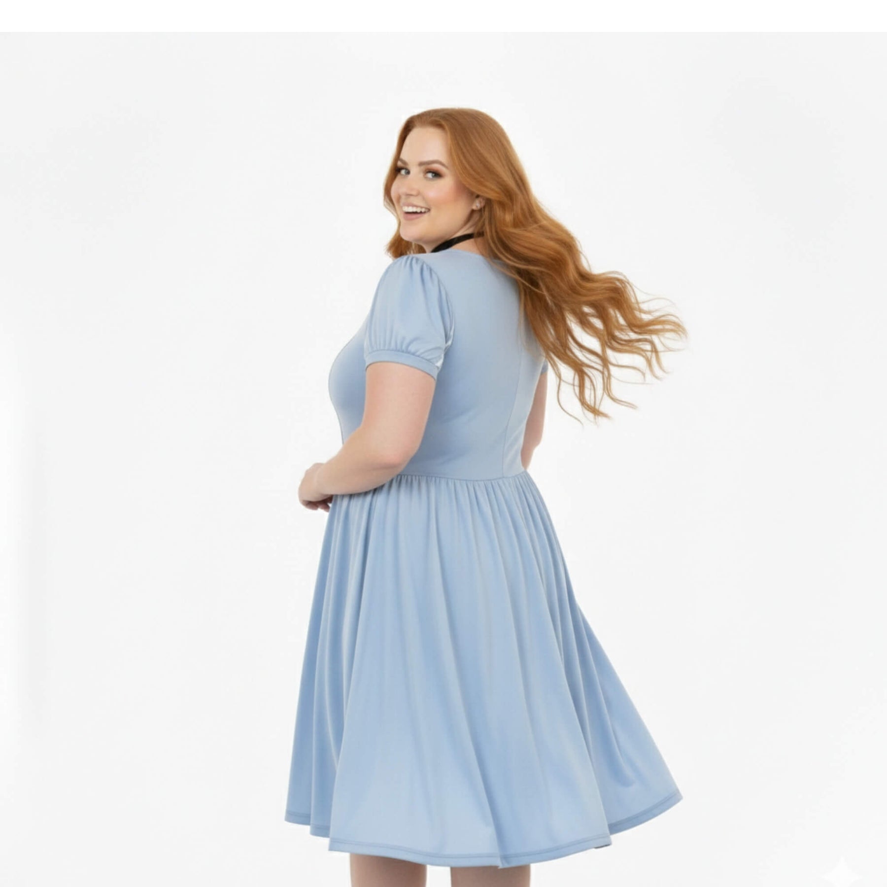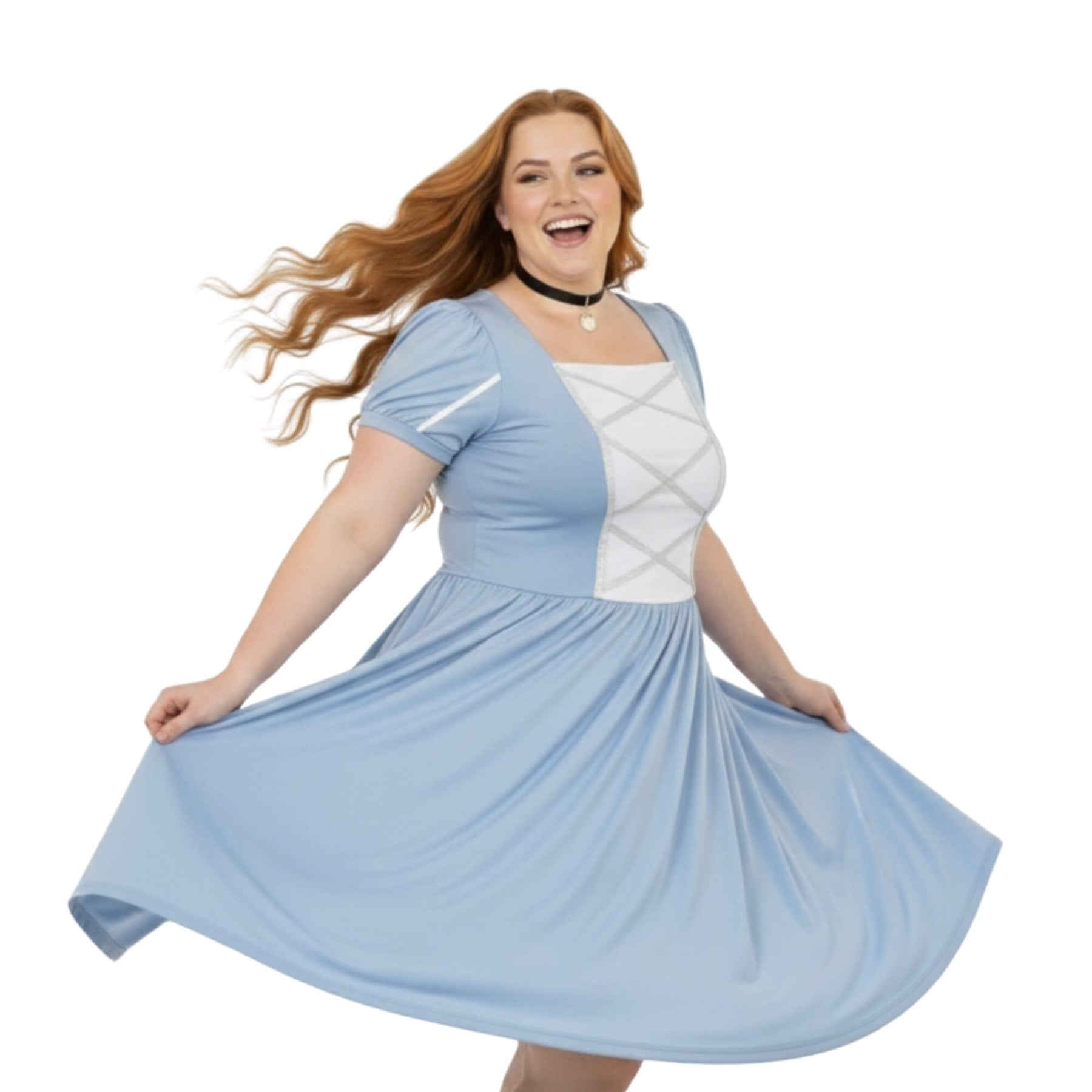 Soft light-blue fabric inspired by Cinderella, designed to drape beautifully on curvy bodies
